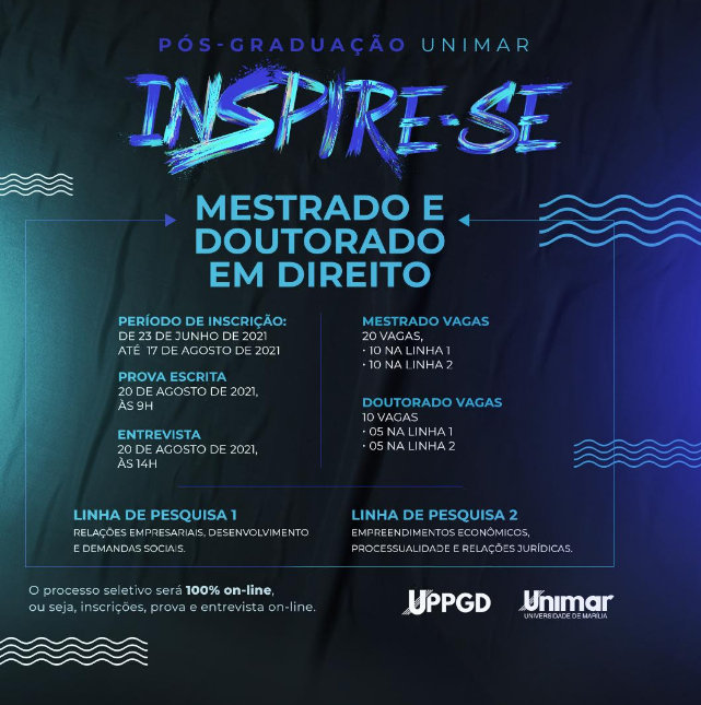 A Universidade de Marília (Unimar) abriu 20 vagas para o mestrado e 10 vagas para o doutorado do Programa de Pós-graduação em Direito (PPGD).