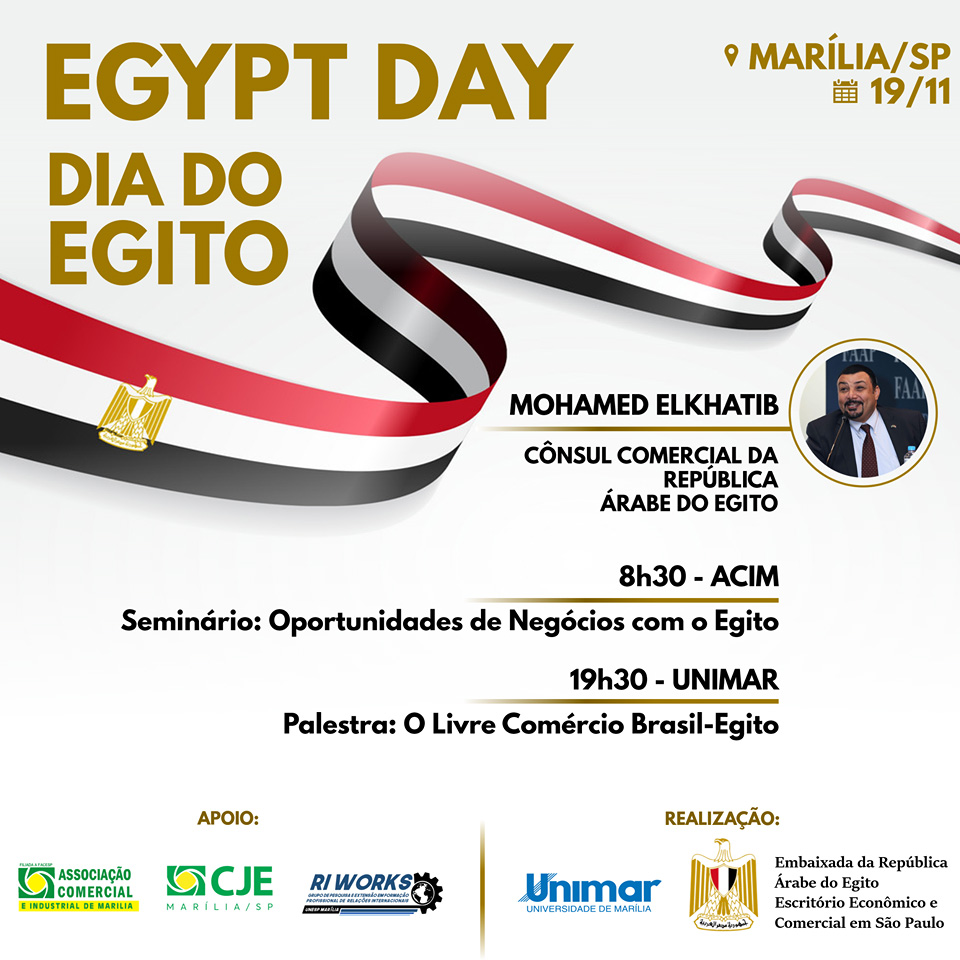 No dia 19 de novembro a UNIMAR – Universidade de Marília por meio do curso de Administração e DRI – Departamento de Relações Internacionais realizará conjuntamente com a Embaixada da República Árabe do Egito no Brasil por meio do Escritório Comercial em São Paulo o evento “Dia do Egito/Egypt Day” focado nas relações comerciais e culturais entre os dois países.
