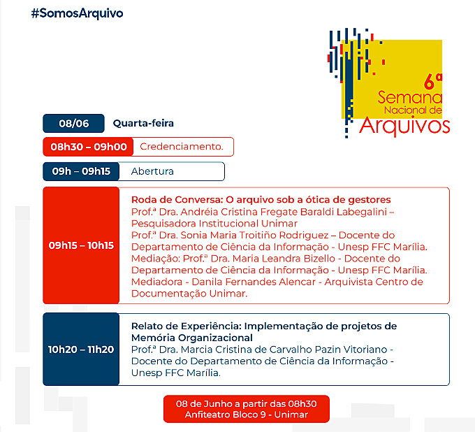 A VI edição tem como tema “#SomosArquivos”, do original #ArchivesAreYou, proposto pelo Conselho Internacional de Arquivos (ICA). O evento será transmitido pelo canal oficial da Unimar.
