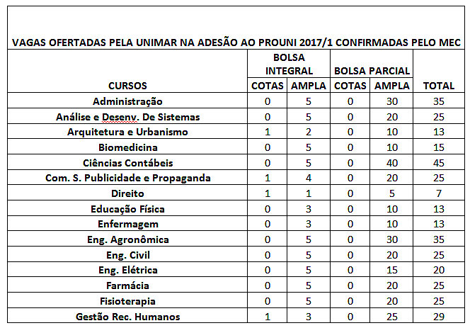A Universidade de Marília (Unimar) está disponibilizando 470 bolsas integrais e parciais do Programa, número que foi confirmado pelo Ministério da Educação (MEC). De acordo com a proposta, o maior número de bolsas será destinado aos cursos de Ciências Contábeis e Pedagogia com 40 vagas parciais (50%) e outras cinco integrais (100%), cada. Em seguida aparece o curso de Administração com 30 bolsas parciais e cinco integrais.