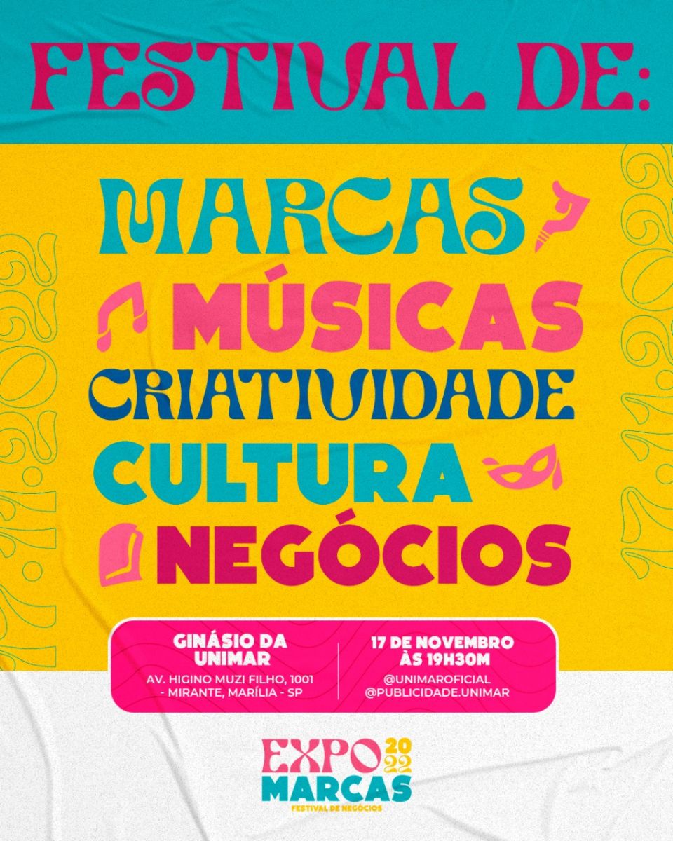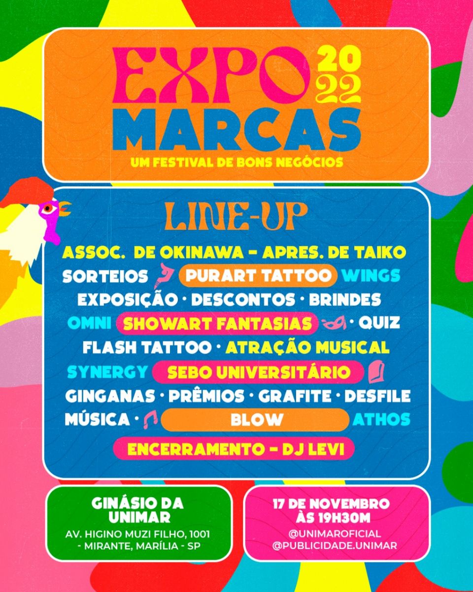 O Expomarcas Unimar será realizado no dia 17 de novembro, a partir das 19h30, no Ginásio de Esportes da Unimar. A entrada é gratuita.