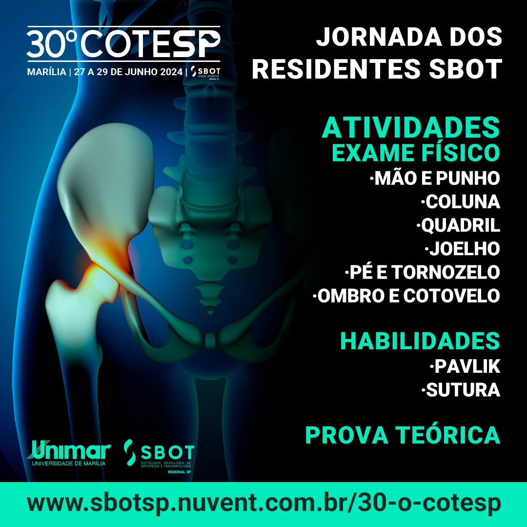 A Universidade de Marília (Unimar) recebe, entre os dias 27 a 29 de junho, um dos mais importantes eventos da comunidade médica ortopédica: a 30ª edição do Congresso de Ortopedia e Traumatologia do Estado de São Paulo (COTESP), organizado pela Sociedade Brasileira de Ortopedia e Traumatologia Regional São Paulo (SBOT-SP). O evento contará com palestras, mesas-redondas e workshops conduzidos por renomados especialistas nacionais e internacionais.