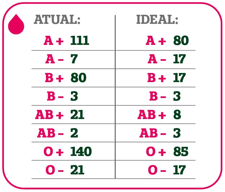 Para conseguir atender toda demanda de Marília e região por 3 dias consecutivos, o hemocentro lista ao lado a quantidade ideal sangue e o que se tem em estoque atualmente.