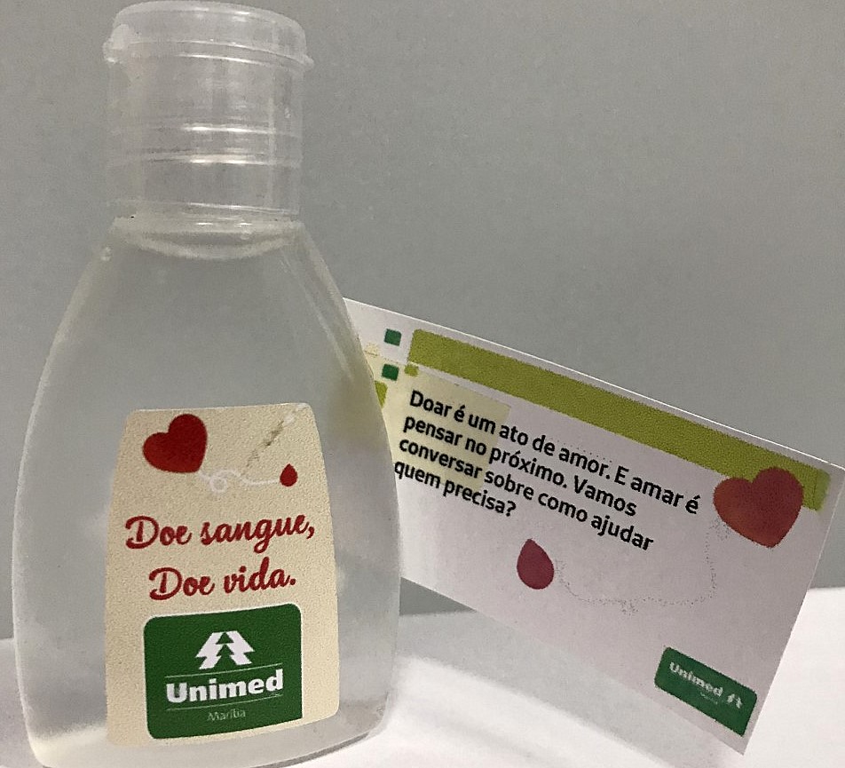 Todos receberam informações sobre como doar, quais os benefícios para o próximo e quem pode fazer esse ato de caridade, juntamente com um álcool em gel personalizado que destacava a mensagem “Doe sangue, doe vida”.