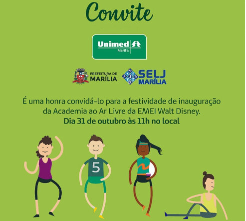 Em comemoração aos 27 anos da Unimed Marília, a cooperativa médica e a Prefeitura de Marília, por meio da Secretaria Municipal de Esportes, Lazer e Juventude (SELJ), entregam para comunidade nesta quarta-feira (31), às 11h, a revitalização da academia ao ar livre da avenida Dr. Calim Gadia (fundos da Emei Walt Disney), zona oeste da cidade.
