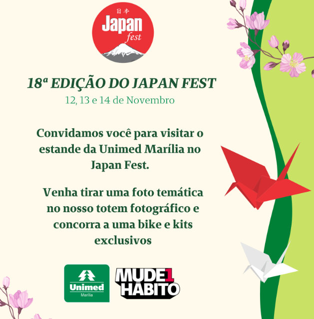 “O Japan Fest está no Calendário Oficial de Eventos do Estado de São Paulo, e a Unimed Marília esteve presente desde a sua primeira edição. Um evento de extrema importância para a cidade e região, que agrega valores, divulga a cultura japonesa, estimula a economia e promove lazer. Este ano será diferente, respeitando todos os protocolos de saúde, para que todos se divirtam com segurança. Fica aqui o convite para todos visitarem nosso estande”, finaliza o presidente da Unimed Marília, Dr. Ruy Yoshiaki Okaji.