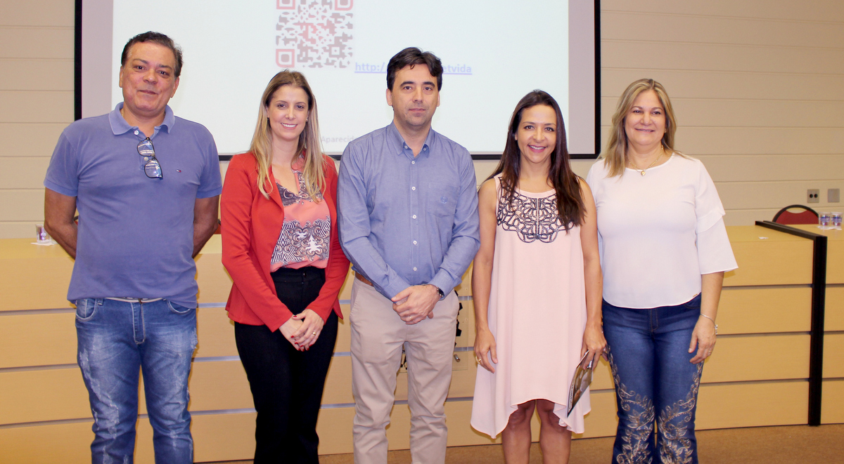 Da esq. Para direita, o supervisor de ensino (DRE), Aparecido Oliveira, a responsável pelo Programa UNIVEM ESCOLAS, Prof.ª Roberta Brondani, o Pró-reitor de Inovação e Desenvolvimento Institucional, Prof. Dr. Elvis Fusco, a Dirigente Regional, Beatriz Muzi Rodrigues e a supervisora de ensino, Sandra Telles Pelegrine