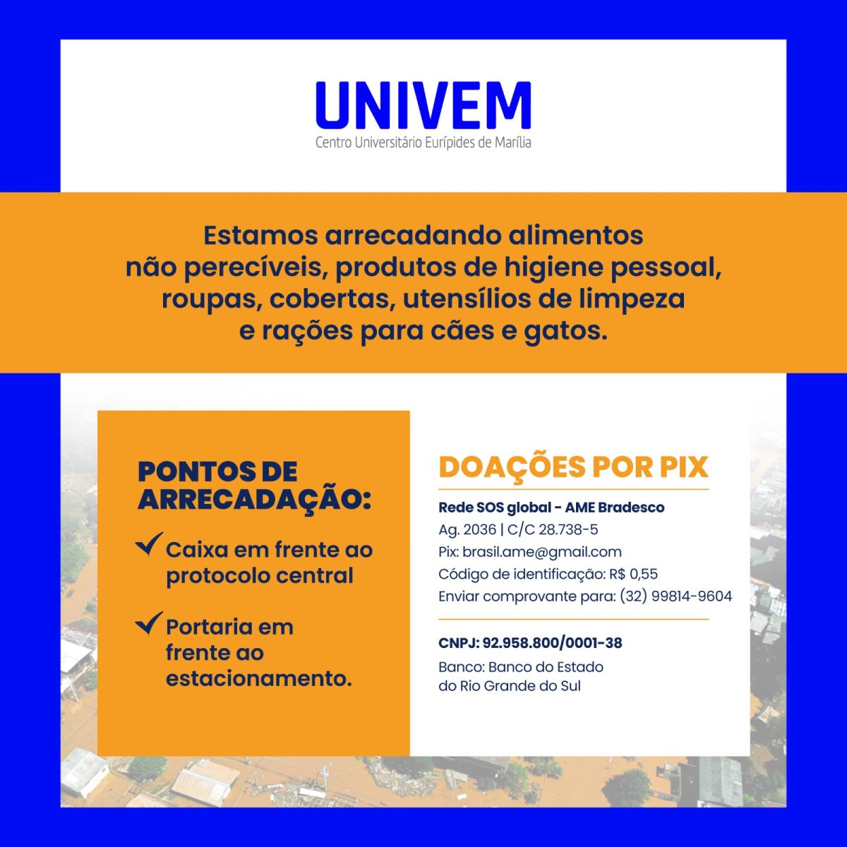 Além disso, o Univem está divulgando que as doações por pix podem ser feitas para o SOS GLOBAL: