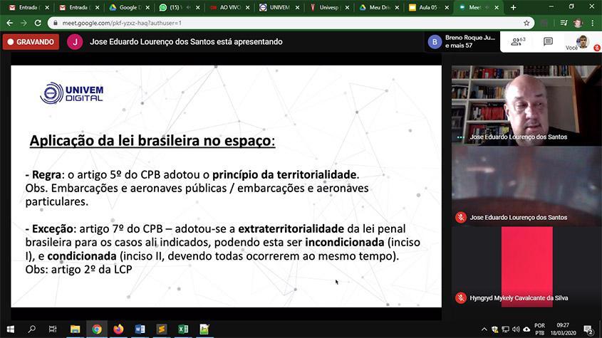 Professor do curso de Direito em aula ao vivo com a participação remota dos alunos