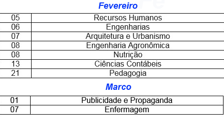 No mês de fevereiro acontece o maior número de cerimônias, 10 no total. Logo no dia primeiro, serão realizadas duas colações: a turma de Odontologia realizará a cerimônia no ginásio de esportes e a turma de Fisioterapia no anfiteatro da reitoria.