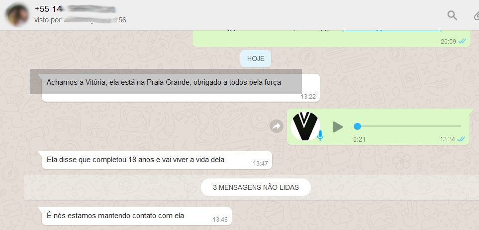 contato via telefone celular, informando que estaria em Praia Grande, no litoral paulista. Mas, não passou muitos detalhes. "Ela disse que completou 18 anos e vai viver a vida dela", contou um dos parentes em mensagem via WwhatsApp ao portal Visão Notícias.