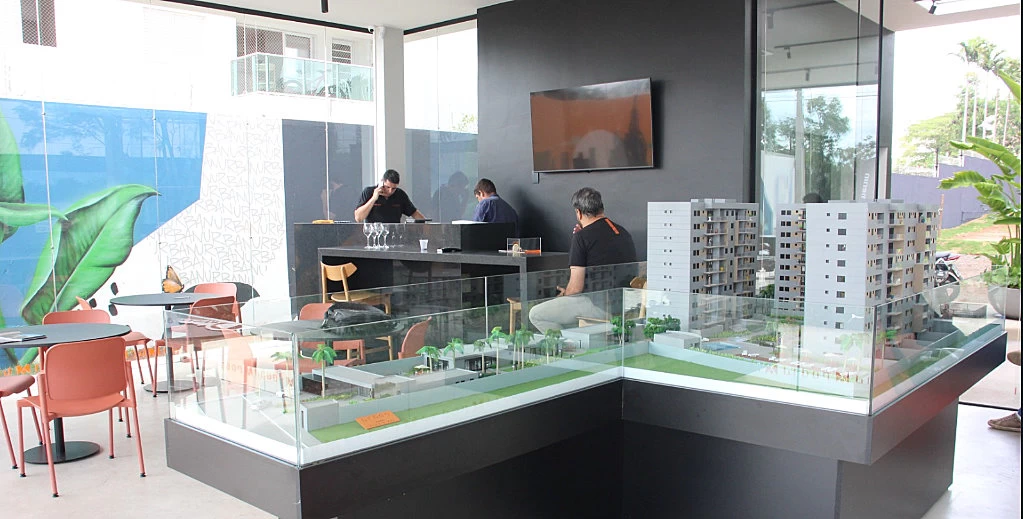 O Urban Esmeraldas conta com um estande de vendas na área do empreendimento com plantão permanente de corretores. No local está em exposição uma maquete em tamanho gigante para que o público interessado possa visualizar o condomínio vertical em três dimensões, facilitando a compreensão e disposição dos espaços e áreas de lazer.