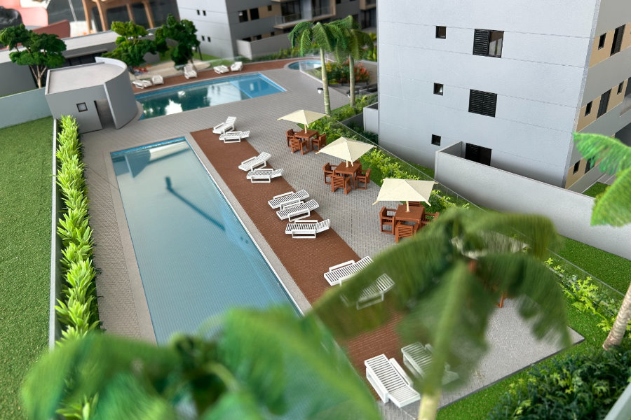 Residencial terá uma piscina de raia de 25 metros e amplas praças de convivência.