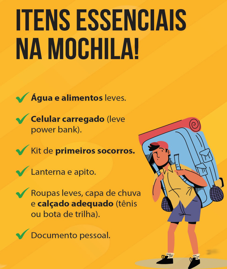 O uso de calçados adequados, com boa aderência, também é essencial para reduzir o risco de escorregões e quedas. Além disso, os bombeiros orientam que trilhas não sejam realizadas em dias chuvosos ou logo após chuvas intensas, período em que o solo fica mais instável, aumentando o perigo de acidentes e deslizamentos.