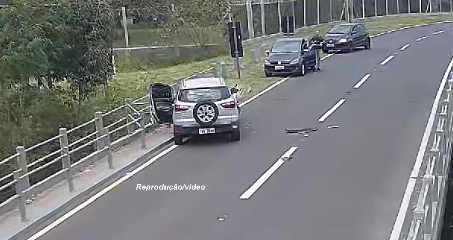 Pelas imagens é possível constatar que a motorista seguia normalmente pela avenida, mas quando inicia o pontilhão o veículo atinge a proteção existente no local.