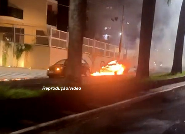 Por motivos que ainda estão sendo apurados, o automóvel (um Siena), estacionado na frente de um edifício residencial, começou a pegar fogo também pelo motor.