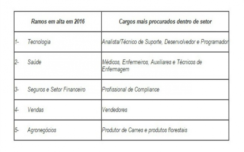 Para comemorar a chegada do Ano Novo, a Catho, site de empregos líder do País, elaborou um ranking com as profissões que mais devem contratar em 2016. Segundo os dados, o ramo de Tecnologia continuará a ser a área mais aquecida no mercado de trabalho.