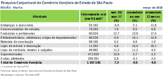 Em março, o faturamento real do comércio varejista na região de Marília atingiu R$ 1,2 bilhão, um crescimento de 7,3% em relação ao mesmo mês de 2017. É a maior receita para um mês de março desde o início da série histórica, em 2008. Tanto no acumulado do trimestre quanto nos últimos 12 meses, as vendas do setor registraram uma elevação de 4,6%.