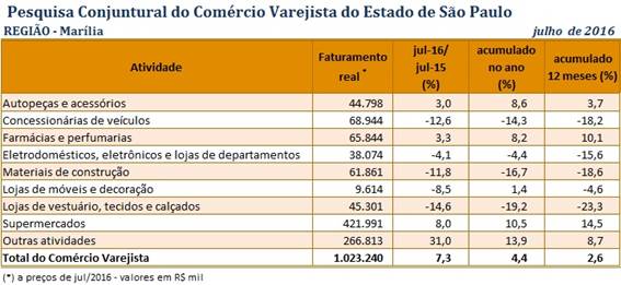 Em julho, o comércio varejista na região de Marília atingiu o faturamento real de R$ 1 bilhão, crescimento de 7,3% na comparação com o mesmo mês de 2015, e que representa o segundo melhor desempenho entre as 16 regiões do Estado. Os dados são da Pesquisa Conjuntural do Comércio Varejista no Estado de São Paulo (PCCV), realizada mensalmente pela Federação do Comércio de Bens, Serviços e Turismo do Estado de São Paulo (FecomercioSP), com base em informações da Secretaria da Fazenda do Estado de São Paulo (Sefaz-SP).