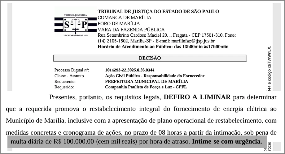 "O perigo de dano, por sua vez, decorre da vulnerabilidade da população do Município de Marília que enfrenta prejuízos milionários em razão da ausência da oferta de energia integral, o que vem impactando comércios e a própria prestação de serviços públicos na municipalidade".