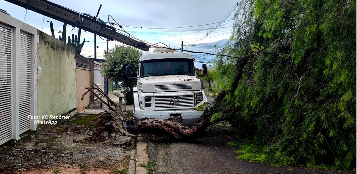 Com isso, os galhos acabaram forçando a fiação da rede elétrica, destruindo um poste de concreto que recebe energia, danificando o muro de uma das casas e também uma carreta que estava estacionada no local.