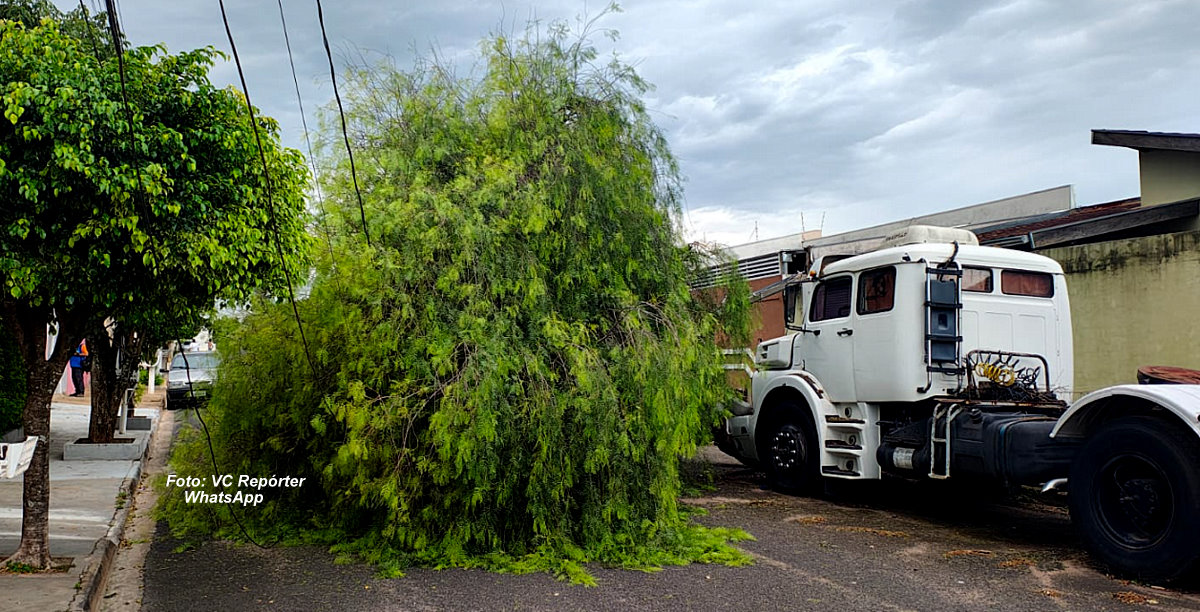 Os ventos fortes e nuvens carregadas, chegando a chover forte em alguns bairros da cidade e também na região, foram os resultados do forte calor que vem ocorrendo nos últimos dias. De acordo com internauta do Visão Notícias, a zona sul da cidade foi uma das mais atingidas, provocando a queda da árvore no Jardim Damasco.