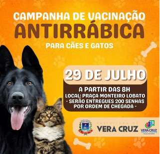 A Diretoria de Saúde e Higiene de Vera Cruz, junto com a Vigilância Epidemiológica realizará no próximo sábado (dia 29), a campanha de Vacinação Antirrábica em Cães e Gatos. O atendimento começará a partir das 8h, na Praça Monteiro Lobato, onde serão distribuídas (por ordem de chegada) 200 senhas para a vacina.