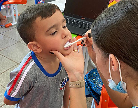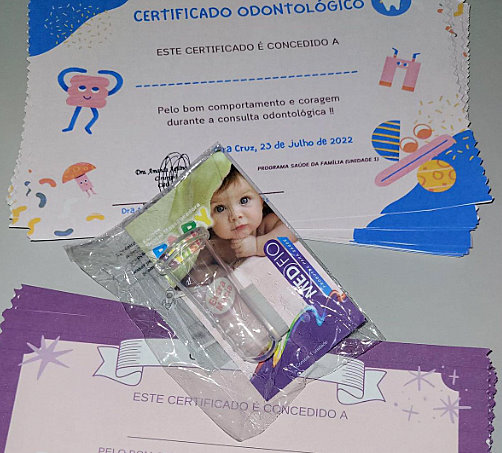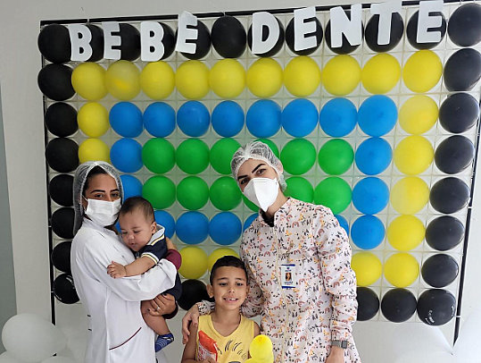 Com relação ao programa Bebê Dente, é feita uma avaliação na faixa etária que envolve dos três meses a até 3 anos e 11 meses, inclusive com orientação às mães sobre as ações de saúde bucal, incluindo o uso de chupetas e mamadeira.