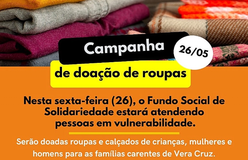 Serão entregues roupas e calçados, cuja campanha contou com apoio das Voluntárias do Fundo Social de Solidariedade e com as doações de toda a comunidade Vera-cruzense.