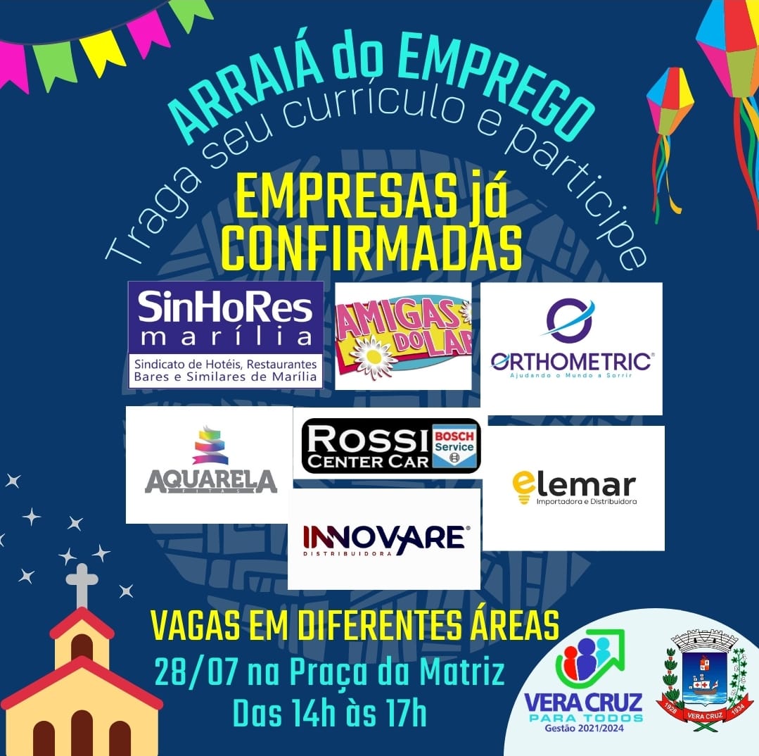 A Prefeitura de Vera Cruz, seguindo orientação do prefeito Davoli, realiza nesta sexta-feira (dia 28) o Arraiá do Emprego 2023. Com apoio de entidades e empresas da região, estarão sendo oferecidas cerca de 80 vagas de emprego, em 14 locais diferentes.