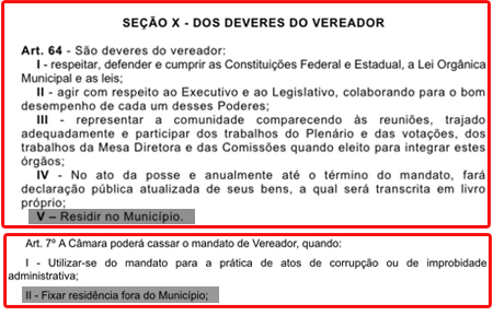 De acordo com a Lei Orgânica do Município, um dos requisitos indispensáveis dos vereadores eleitos é que devam residir no município e, por outro lado, será passível de cassação "se fixar residência fora do município".