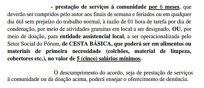 A proposta tem duas alternativas: prestação de serviços à comunidade por 6 meses (aos finais de semana e feriados ou em qualquer dia útil sem prejuízo do trabalho normal) ou doação de cestas básicas à entidade assistencial no valor de cinco salários mínimos.