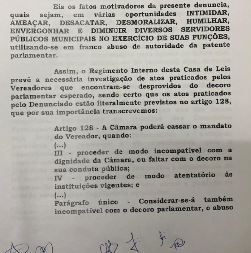 Entre as justificativas para a cassação, conforme o documento, estão conduta incompatível do vereador com a dignidade da Câmara e falta de decoro em atuação pública.