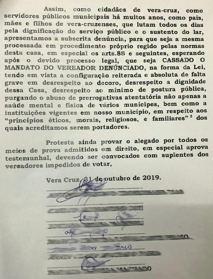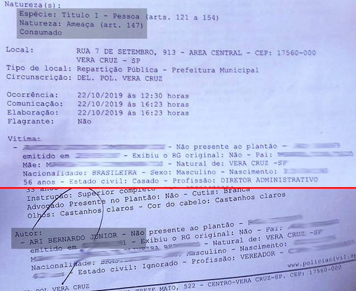 Trecho do boletim de ocorrência registrado na Delegacia e da denúncia feita à Câmara: