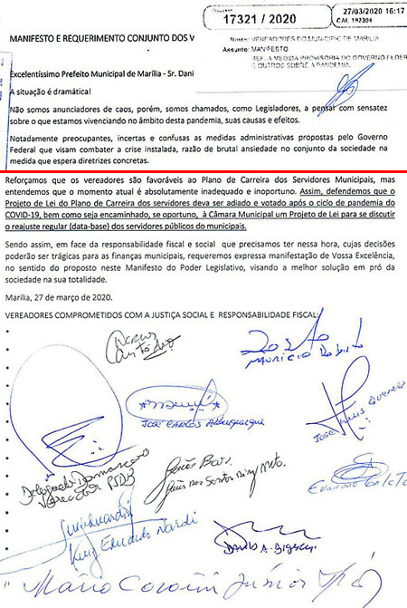 Justificativa - O vereador Wilson Damasceno, que assinou o documento, disse nesta tarde ao Visão Notícas que "ter calma neste momento que muita gente chorando a perda de vidas; de empregos; redução de salários; redução de salários de servidores da União e Estados; políticos, inclusive nós vamos propor isso na Câmara; perda de receita em todos os entes e Marília não será diferente".