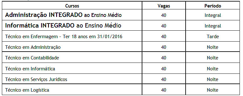 Entre as novidades deste processo seletivo está o curso de Técnico em Informática no período noturno. Três cursos técnicos – Administração, Comércio e Secretariado – são oferecidos na modalidade on-line.