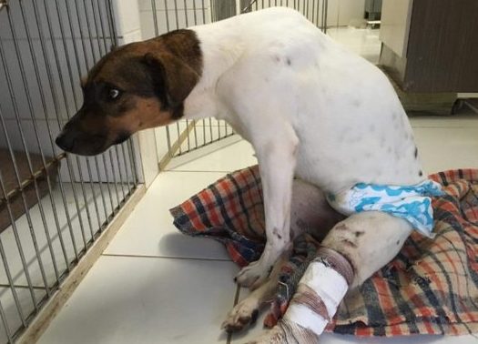 Faixas e esparadrapos também são utilizados para evitar que as patinhas do cachorro fiquem ainda mais machucadas enquanto ele as arrasta.