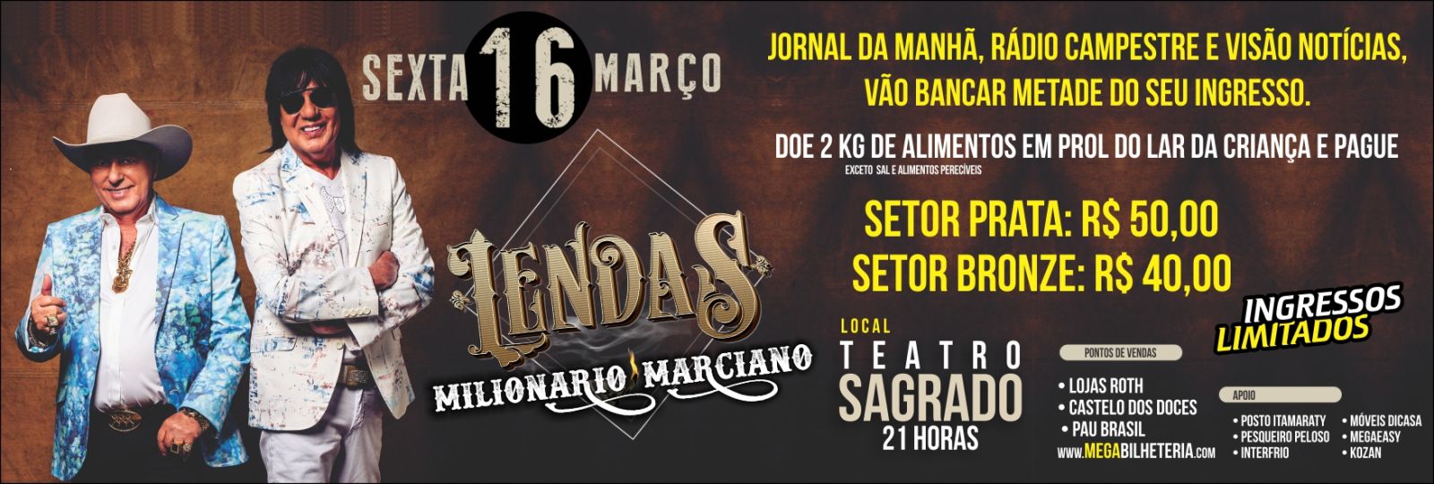 Os internautas do portal Visão Notícias vão poder assistir ao show "Lendas", com Milionário e Marciano, pagando apenas metade do valor do ingresso. A parceria foi fechada com os organizadores do evento que acontece nesta sexta-feira (dia 16), a partir das 21h, no teatro do Sagrado Coração. A realização é de Alves Dias Produções.