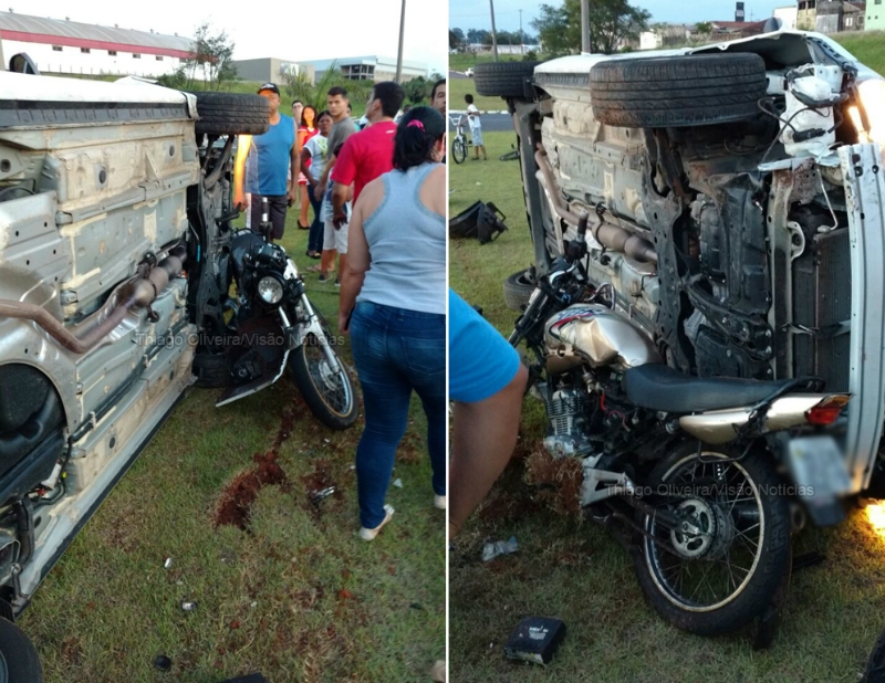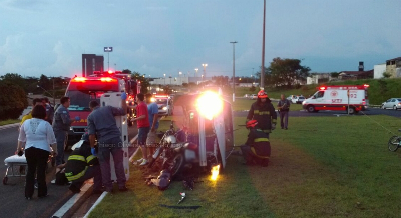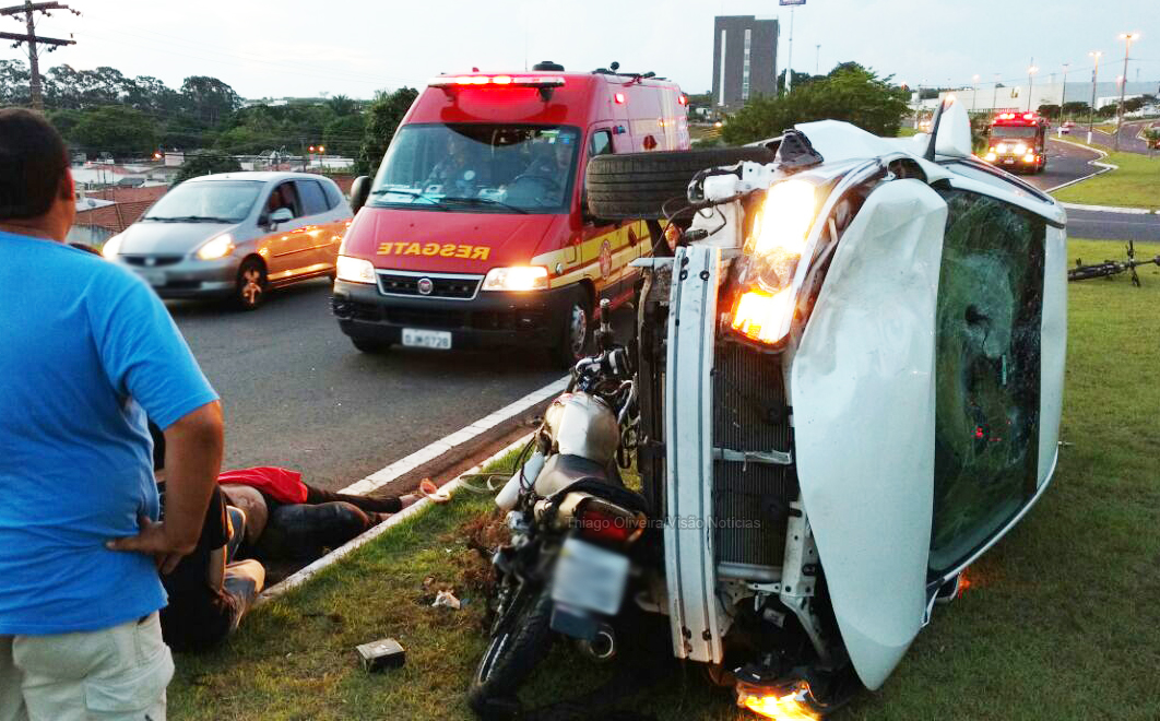 Grave acidente envolvendo carro e moto foi registrado no início da noite deste domingo (23) na avenida Sanchez Cibantos, zona norte de Marília.