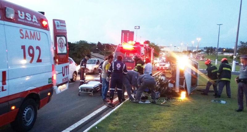 Um Corolla branco com placas de Júlio Mesquita que seguia no sentido rodovia-centro transportando um jovem que havia sofrido corte no pescoço durante um acidente em um sítio na região colidiu violentamente contra uma moto que havia acabado de acessar a avenida por uma alça de acesso do Jardim Aquárius. De acordo com testemunhas, o condutor da motocicleta pretendia acessar o retorno para a zona norte e teria avançado para a faixa esquerda de maneira brusca, entrando na frente do carro, que não conseguiu desviar. Após o violento impacto, a moto foi arrastada por quase 15 metros, e ao parar, acabou esmagada pelo carro, que tombou.