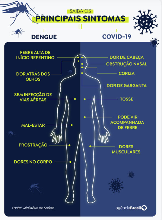 Enquanto a infecção por dengue acontece pela picada do mosquito Aedes aegypti, a infecção por covid-19 se dá por via aérea, por contato próximo a uma pessoa doente, como tosse ou espirro.