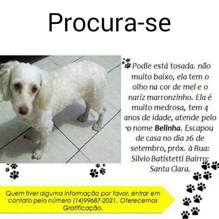 Ei, você viu a Belinha, esta Poodle da foto? A Belinha desapareceu de sua casa, na rua Silvio Batistteti, no jardim Santa Clara, zona sul de Marília, na tarde do último sábado, 26, e desde então não foi mais vista.
