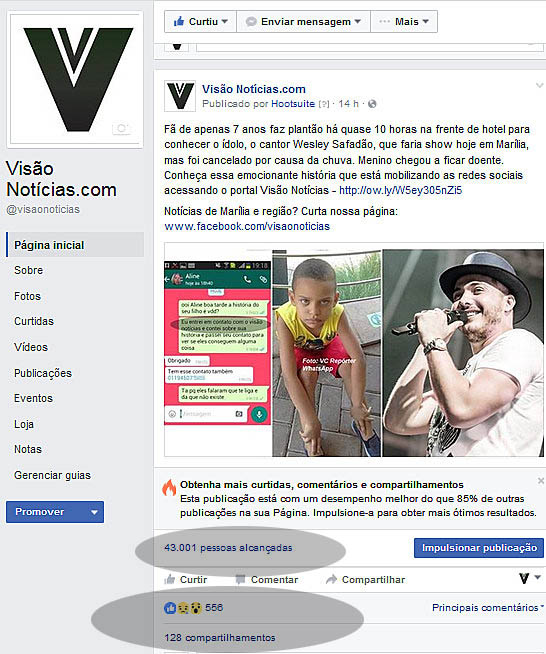 A história do menino Hugo Pereira Nascimento, que mora em Padre Nóbrega, emocionou e também revoltou milhares de pessoas. Nas redes sociais houve uma campanha para conseguir a realização do sonho. A notícia divulgada com exclusividade pelo portal Visão Notícias.com teve mais de 43 mil visualizações, 556 curtidas e 128 compartilhamentos - apenas na Fan Page oficial. Entre os comentários, muitas críticas à produção do artista pelo descaso.