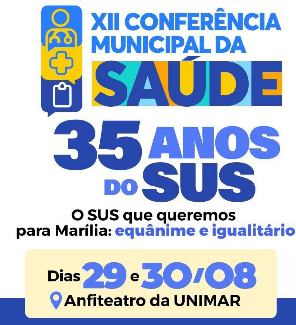Será aberta oficialmente nesta sexta-feira (29), às 19 horas, no Anfiteatro da Unimar (Universidade de Marília), a XII Conferência Municipal da Saúde. Com o tema “35 anos do SUS, o SUS que queremos para Marília: equânime e igualitário”, o evento é promovido pela Prefeitura de Marília, por meio da Secretaria Municipal de Saúde e em parceria com o Conselho Municipal de Saúde (COMUS).