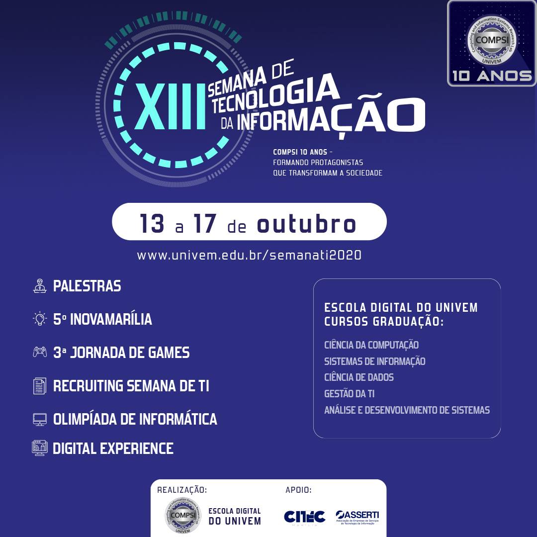 Tem início, na próxima terça-feira, dia 13, a XIII Semana de Tecnologia da Informação do UNIVEM, organizada pelos cursos de Sistemas de Informação, Ciência de Dados e Ciência da Computação da instituição. As inscrições estão abertas e podem ser realizadas pelo site: www.univem.edu.br/semanati2020.