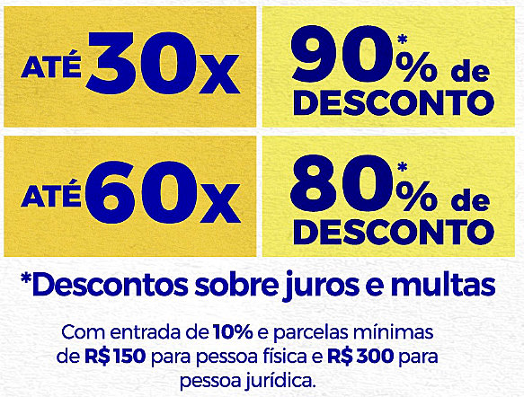 - Com 10% de entrada e o saldo em 31 até 60 parcelas mensais e consecutivas, com valor mínimo por parcela de R$150,00 para pessoa física e R$300,00 para pessoa jurídica: desconto de 80% sobre o valor de juros e multas.