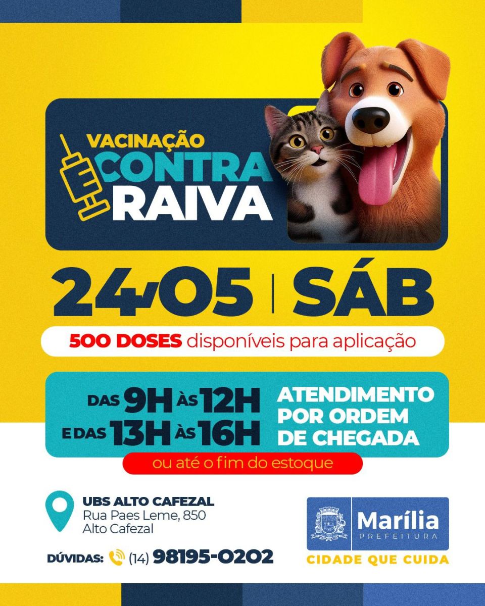 A ação, promovida pela Secretaria Municipal da Saúde, com apoio da Unimar (Universidade de Marília), por meio do curso de Medicina Veterinária, vai disponibilizar 500 doses da vacina e será feita por ordem de chegada nos seguintes horários: das 9h às 12h e das 13h às 16h ou até o fim do estoque.